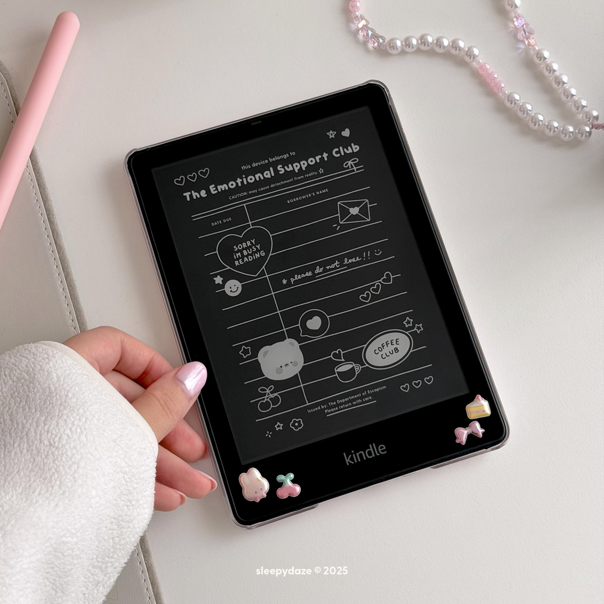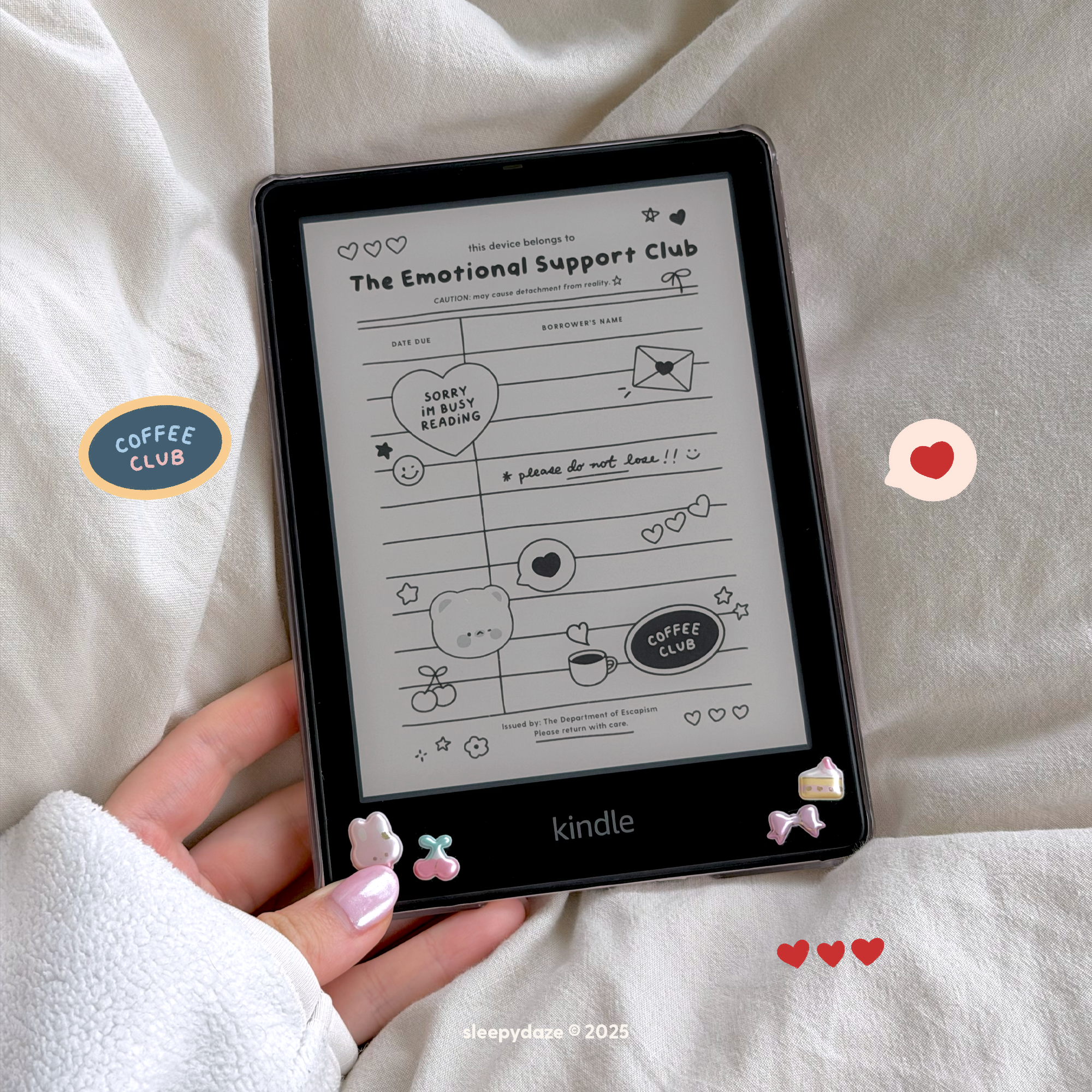 Do you want to join our emotional support club? 🤔 If so, here's your e-reader! It comes with a little borrowing card that you must display as a club member! It's even decorated with stickers and notes so your library of books always looks happy. 📚💖 This is a cute hand-drawn screensaver for your Kindle/Kobo e-reader~